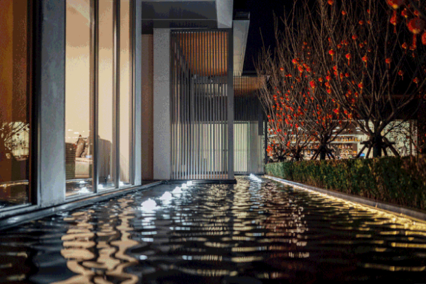 項目中庭空間整體營造了寧靜詩意的氛圍空間,活力中心入口一側運用優秀的縱深關系,為整體入口的休閑區帶來開闊的觀景視野。帶狀的整形綠化和水體基底配合,以一條賦有儀式感的歸家之路,營造出靜謐優雅的社區空間體驗。