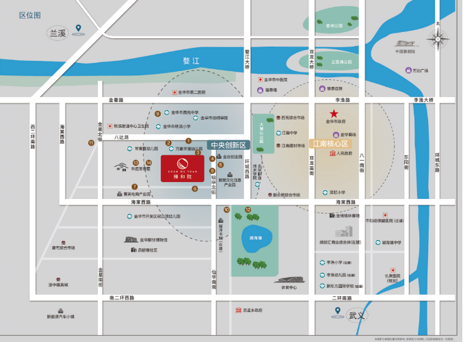 萬科臻和院位于金華市經開區,南鄰湖海塘板塊,北靠八達路及萬豪天禧社區、東臨仙華北街(斜對面為浙中進口葡萄酒市場)、南接美和路、屬于江南主城核心板塊;距離市政府直線約3公里,毗鄰規劃中的中央創新區;沿八達路往東可直達江南銀泰商圈,美和路往東約500米可達金職院,周邊配套十分成熟 。
